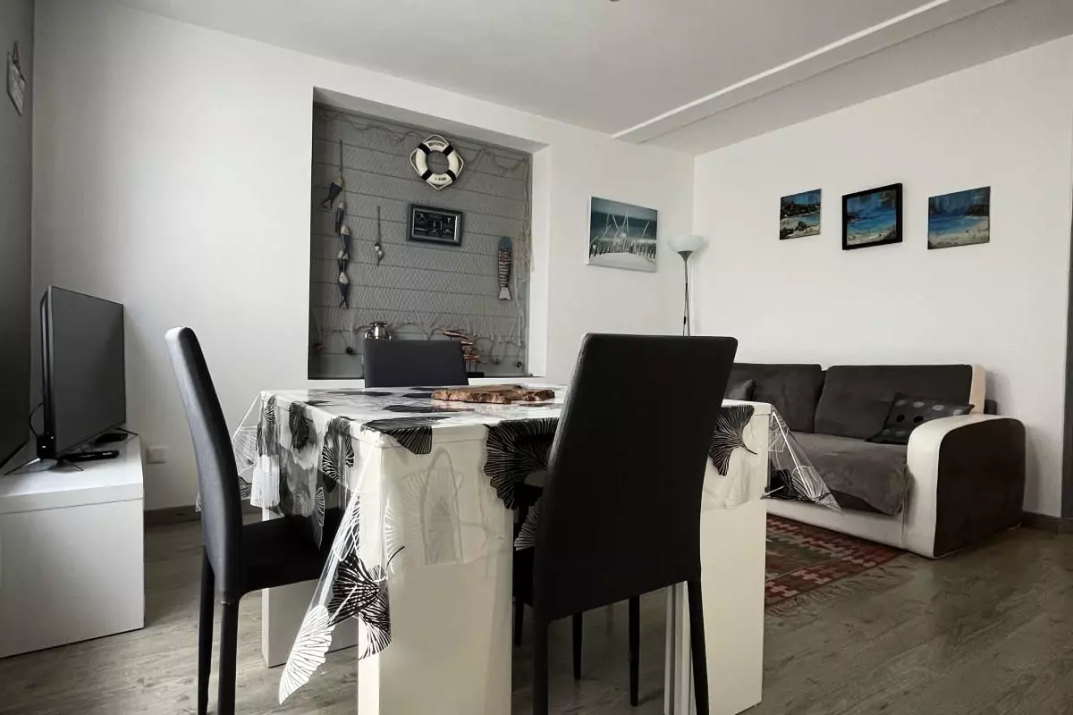 The apartment is decorated in a nautical style and is located in an enclosed courtyard, which allows for safe parking.