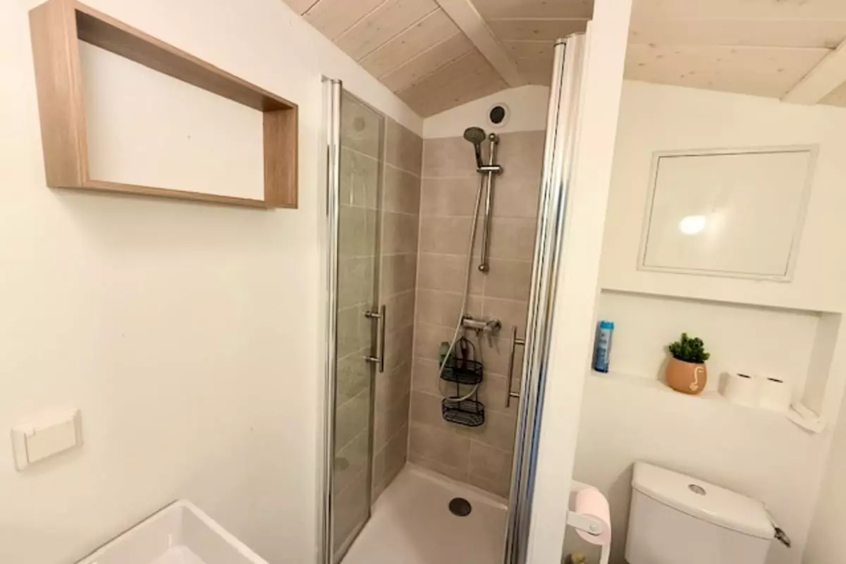 It includes a sleeping area with a 160 x 190 cm double bed, a fully equipped kitchen for preparing meals, a functional shower room, and a dining area with a table and chairs. The comfortable living room has a sofa, perfect for relaxing after a day of exploring.