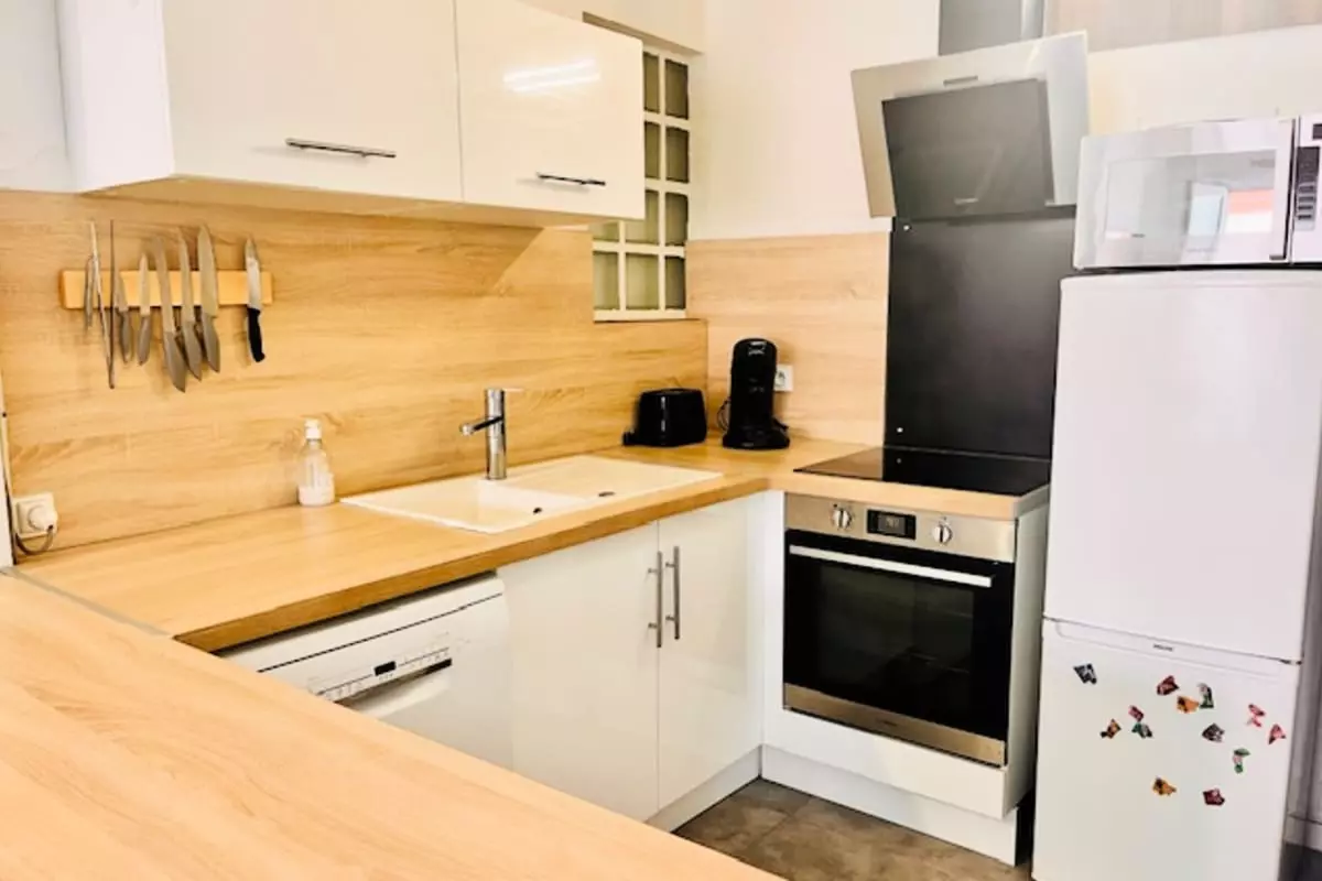 One of the apartment's greatest assets is its brightness, combined with an ideal location. You'll find numerous restaurants nearby, and a Carrefour City supermarket just a 1-minute walk away for your daily shopping needs. Furthermore, a public parking lot is located right below the building, making getting around by car very convenient.