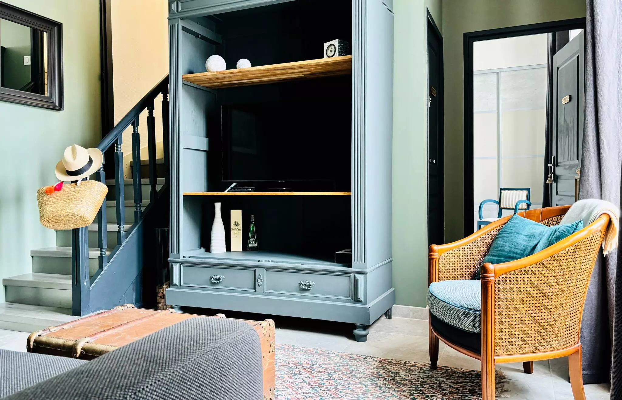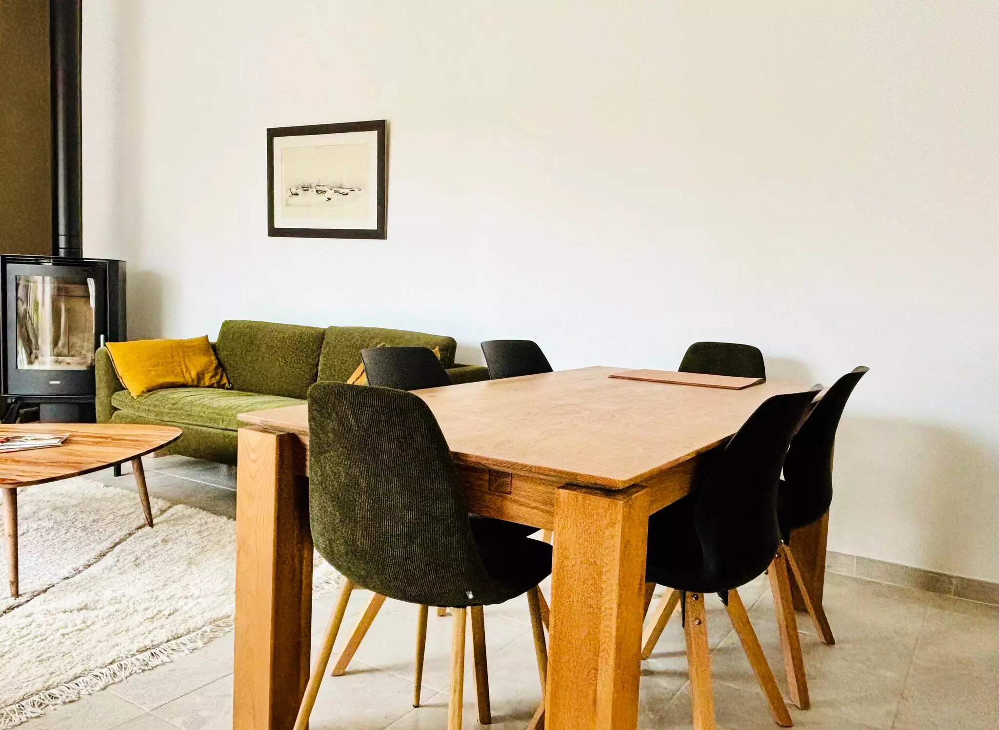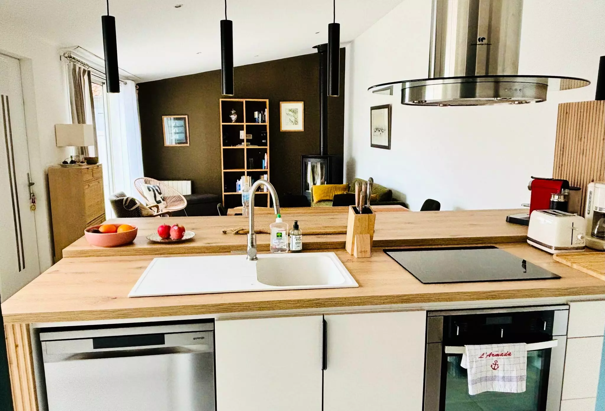 It has one bedroom on the ground floor and two others upstairs, a bathroom with a shower and a bathtub, a separate toilet, a living room equipped with a connected TV with WIFI, a dining room and a fully equipped open kitchen:
