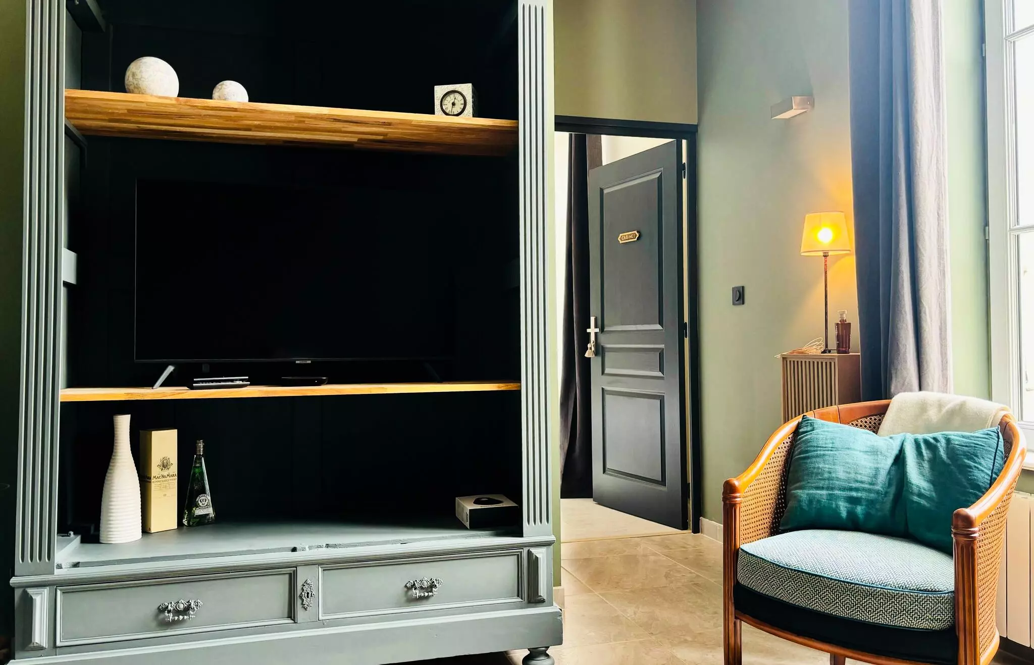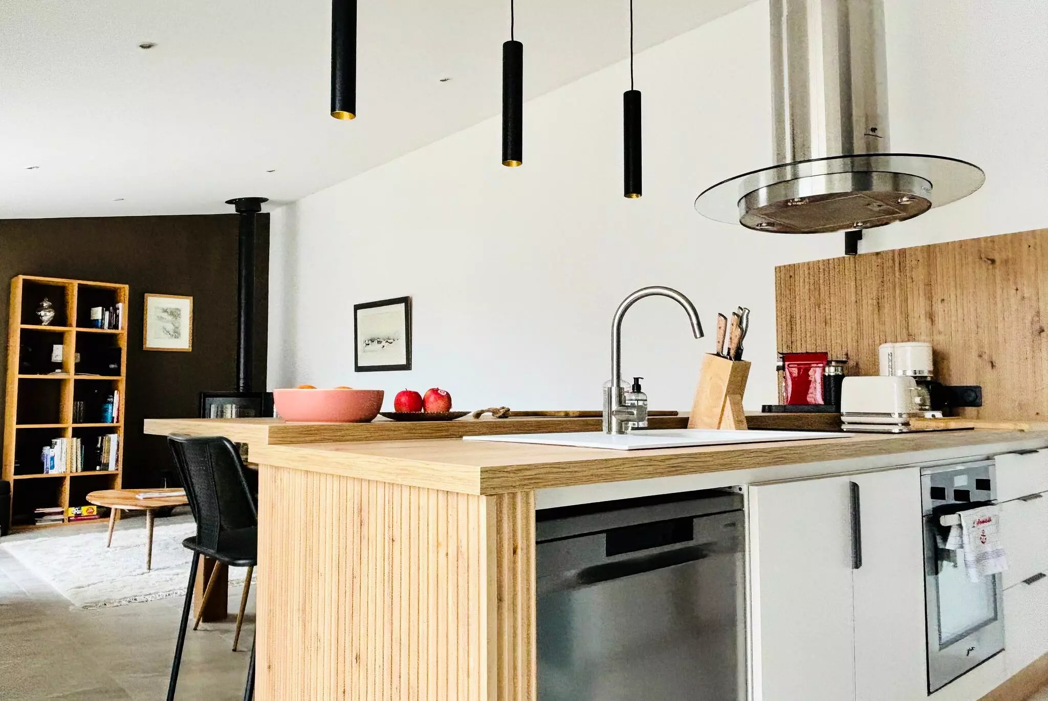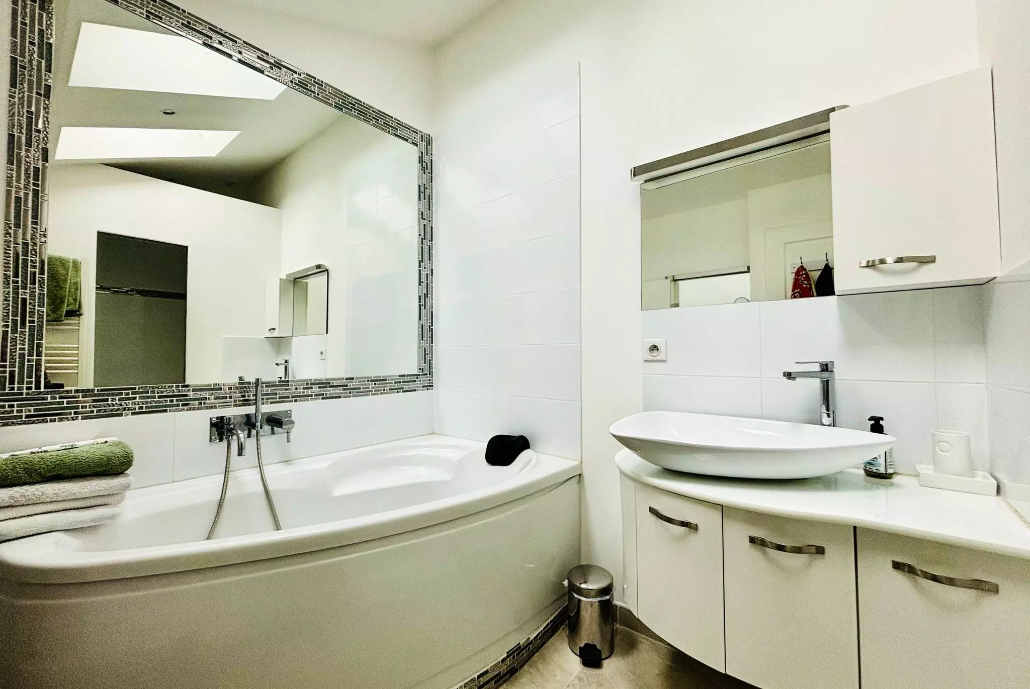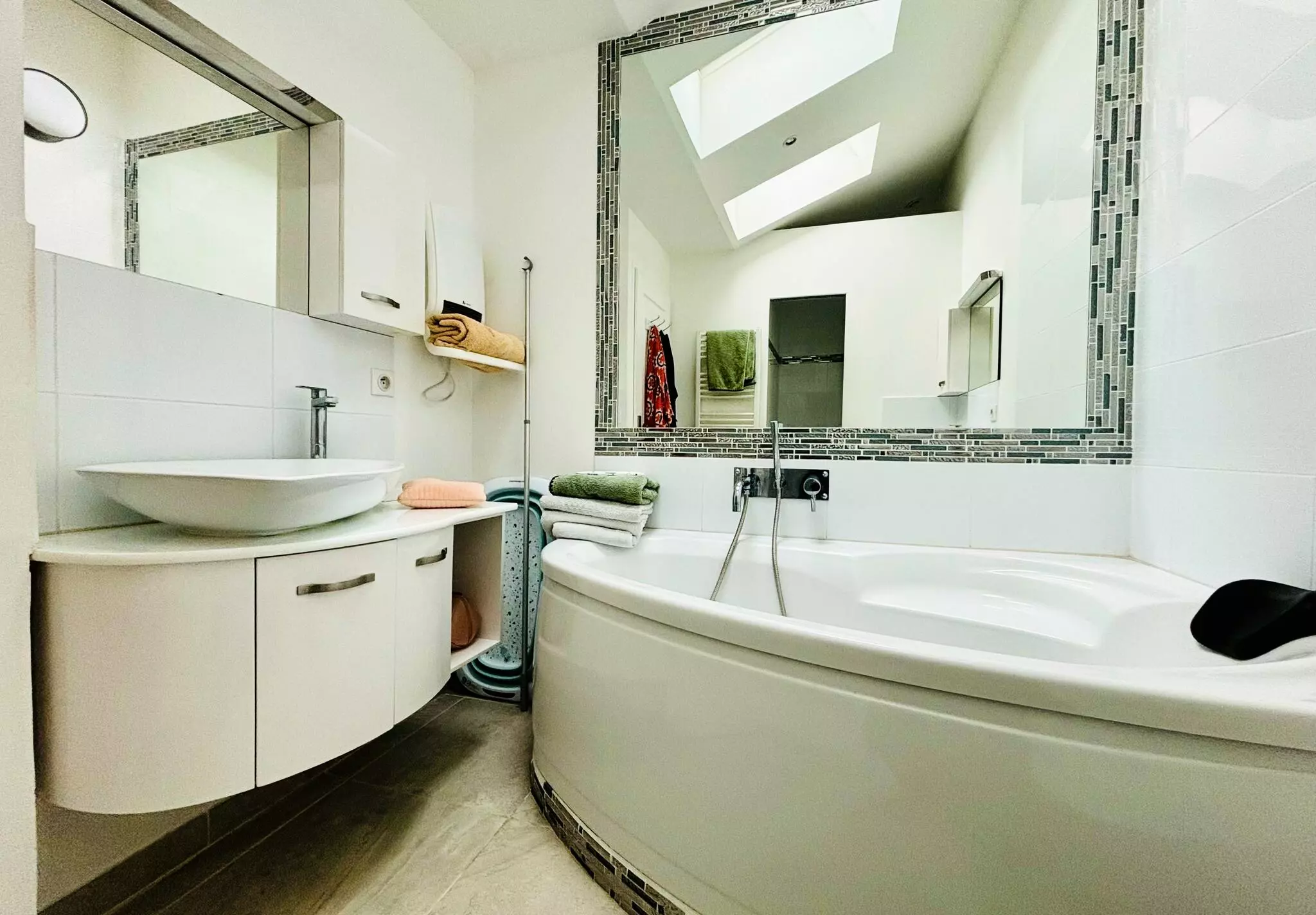 It has one bedroom on the ground floor and two others upstairs, a bathroom with a shower and a bathtub, a separate toilet, a living room equipped with a connected TV with WIFI, a dining room and a fully equipped open kitchen: